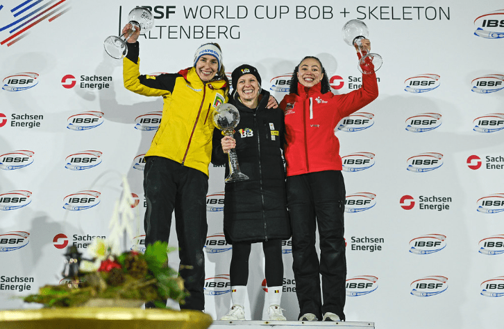 Home hero Pfeifer won in Altenberg and will go into the Olympics as one of the favourites after also claiming victory in the World Cup opener on the Olympic track. Kreher made it a German 1-2 while Meylemans took third. In the overall World Cup standings, Meylemans became the first ever Belgian winner of the Crystal Globe. Pfeifer is the runner-up while Stoecker takes Britain’s first overall female World Cup medal in over a decade in third.